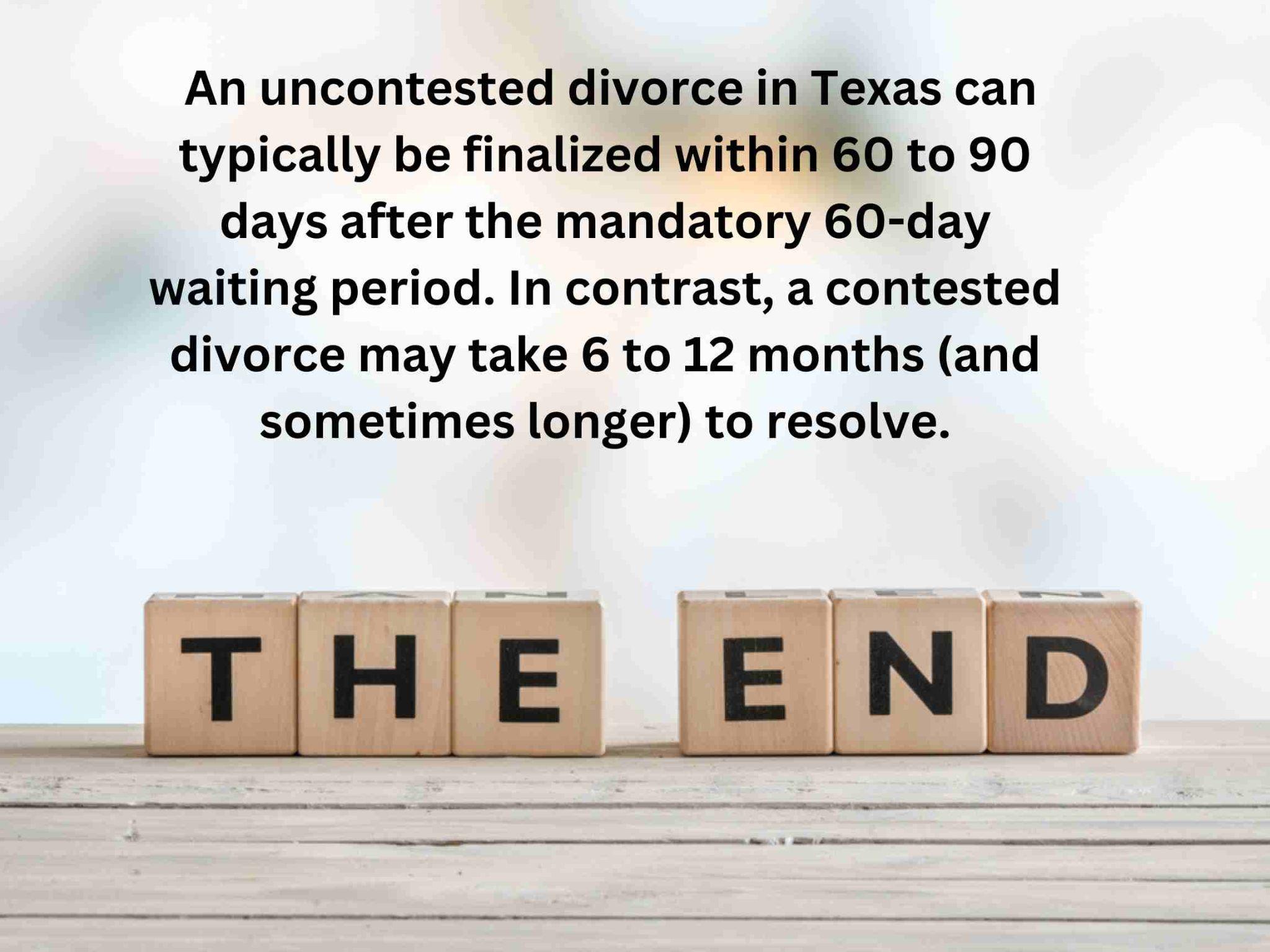 By Texas law, there’s a 60-day “cooling-off” period after filing. Use this time for negotiations, mediation, or drafting a marital settlement agreement if aiming for an uncontested divorce.
